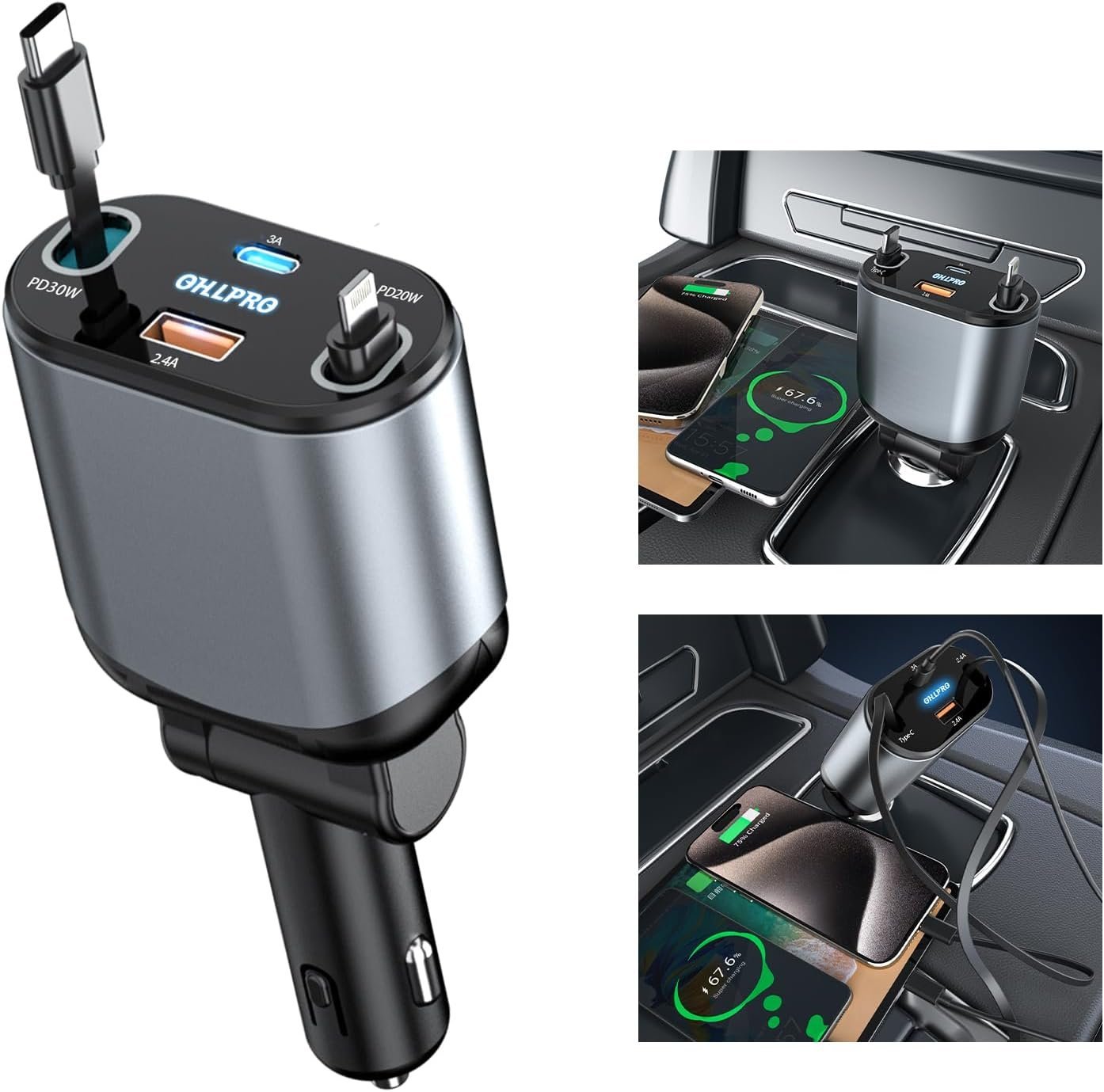 علشان دايمًا بتكون في الطريق ومحتاج شاحن عملي، سريع، وأنيق.. جبنالك شاحن السيارة الترند 4 في 1 اللي هيشحنلك موبايلك وإنت مطمن، وبدون كركبة كابلات! – شاحن واحد يغنيك عن أي شاحن تاني! ⚡